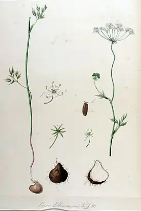 ![]() Ilustración de la especie (bajo el sinónimo Carum bulbocastanum) en Flora Batava of Afbeelding en Beschrijving van Nederlandsche Gewassen, Vol. XI, 1853. | ||