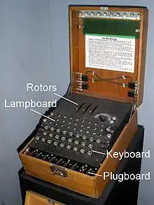 En 1926, la Armada alemana adoptó, como su principal dispositivo criptográfico, una máquina civil Enigma modificada; en 1928 el Ejército alemán siguió su ejemplo.[17] La complejidad del sistema se incrementó mucho en 1930 con la introducción de un tablero de enchufes (Steckerbrett), aunque con solo seis cables de conexión en uso.[18] En diciembre de 1932, Marian Rejewski hizo lo que el historiador David Kahn describiera como uno de los mayores avances en la historia de la criptografía, aplicando las matemáticas puras —la teoría de los grupos de permutaciones— para romper los cifrados de la máquina Enigma de las fuerzas armadas alemanas.[19][20] Rejewski había elaborado las interconexiones precisas de los rotores y el reflector de Enigma, después de que el Buró hubiera recibido, del capitán de la inteligencia militar francesa Gustave Bertrand, dos documentos alemanes y dos páginas de claves diarias de Enigma —para septiembre y octubre de ese año—,[21] que habían sido obtenidas por un agente de la inteligencia militar francesa, un alemán de nombre en clave «Rex»,[lower-alpha 2] de un agente que trabajaba en la Oficina de Cifrado de Alemania en Berlín, Hans-Thilo Schmidt, a quien los franceses llamaban «Asché».[lower-alpha 3][22]