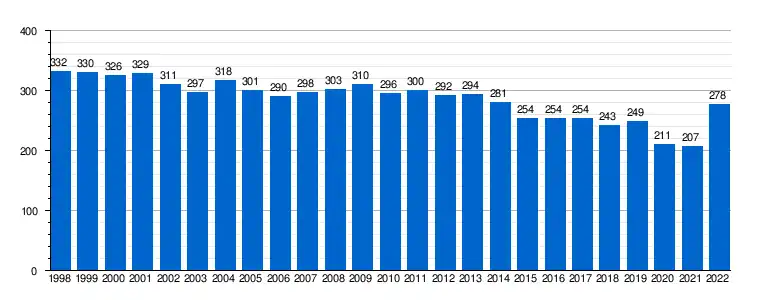 | Gráfica de evolución demográfica de Burbáguena[6] entre 1998 y 2022 |