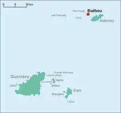 Burhou[1] es una pequeña isla de aproximadamente 1,4 millas (2,25 km) al noroeste de Alderney que forma parte de las Islas del Canal.[2] No tiene residentes permanentes, y es un reserva natural de aves, por lo que el aterrizaje en la misma está prohibido del 15 de marzo al 27 de julio. La fauna de la isla incluye una colonia de frailecillos (que esta disminuyendo) y un gran número de conejos.