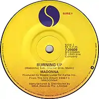 Sire Records publicó «Burning Up» el 9 de marzo de 1983 como el segundo sencillo del álbum, después de «Everybody».[9] Al igual que su predecesor, no logró entrar en el Billboard Hot 100, la lista oficial de Estados Unidos, ni tampoco en Bubbling Under Hot 100 Singles.[10] Sin embargo, sí alcanzó el tercer lugar en el conteo Dance Club Songs y permaneció allí por dieciséis semanas.[11] Para septiembre de 1983, la revista Radio & Records reportó que se habían vendido más de 150 000 copias del sencillo.[12] Por último, en junio de 1984 alcanzó la posición trece en Australia después de haber alcanzado inicialmente los tramos inferiores de los cien lugares en noviembre del año anterior.[13]