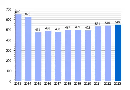 | Gráfica de evolución demográfica de Buscastell entre 2013 y 2023 |