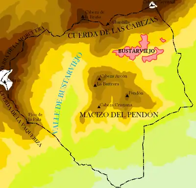 La tercera zona montañosa queda totalmente en tierras de Bustarviejo. El punto principal es el Pendón, un cerro granítico de 1545 metros.