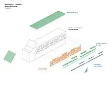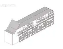 Es un edificio de 1500 metros, atravesado por calles, cuya altura varía entre los 4 y 8 pisos de altura. Tuvo como objetivo trazar una barrera acústica respecto de la autopista que pasaría por el costado del barrio, pero que finalmente nunca se construyó. Esta operación estableció una condición de borde respecto de su interior, dejando las viviendas de menor altura hacia el sur, libres de la sombra proyectada por el edificio perimetral. Su fachada norte tiene dibujado un patrón de ladrillos de diferente color, que unifica el total del muro definiendo la identidad del proyecto.[2] La fachada sur tiene revestimientos en madera y albañilería, y balcones construidos como estructuras añadidas en madera (ver Axonométrica).