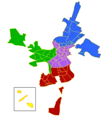 El término municipal de Cáceres, con una superficie de 1750,23 km², es el más extenso de España[8] y en el mismo se ubican tanto la ciudad de Cáceres como tres pedanías: Estación Arroyo-Malpartida, Rincón de Ballesteros y Valdesalor.[10] Existen además numerosos lugares habitados diseminados por el municipio, incluyendo castillos y cortijos con varios siglos de historia y ocho núcleos irregulares.[12] La ciudad se organiza desde 2008 en cuatro distritos: Centro-Casco Antiguo, Norte, Oeste y Sur; un quinto distrito, Pedanías, abarca la parte no urbana del término.[13][14] Según los datos oficiales del INE de 2021, el municipio tenía ese año una población de 95 418 habitantes, de los cuales 94 326 vivían en la propia ciudad, siendo el segundo núcleo más poblado de Extremadura tras Badajoz.[10] Es el centro de un área urbana que supera los cien mil habitantes, en la cual vive entre la cuarta y tercera parte de la población provincial.[10][15][16] Los datos reales de población municipal varían notablemente por su población flotante de más de treinta mil personas, la mayoría relacionadas con centros educativos[17] como el Campus de Cáceres de la Universidad de Extremadura[18] o el CEFOT-1 del Ejército de Tierra;[19] por el contrario, la ciudad suele vaciarse en verano, al regresar muchos vecinos a sus localidades de origen.[20][21]