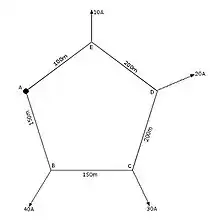 - Ahora, basándonos en la Ley de Nudos de Kirchhoff, vamos restando de izquierda a derecha las intensidades a , hasta el primer resultado negativo. Esta intensidad negativa debe coincidir, tanto si la calculamos de izquierda a derecha como de derecha a izquierda. El punto donde aparece dicha intensidad es el Punto de Mínima Tensión.