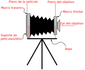 El fuelle es flexible, con un plegado tipo acordeón. Cubre el espacio entre el objetivo y la película, y se flexiona para acomodar los movimientos los marcos.[3] El marco frontal es una placa en el frente de la cámara que sostiene el objetivo y, normalmente, un obturador.