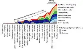 Se ha observado en un estudio de comparación genómica pan-cáncer entre tumores primarios y metastásicos que el cáncer de próstata experimenta cambios significativos en su paisaje genómico durante las etapas avanzadas de la enfermedad.[22]El cáncer de próstata metastásico mostró una mayor clonalidad en comparación con el cáncer primario, lo que sugiere una evolución hacia subclones más dominantes en etapas metastásicas. También se observaron cambios sustanciales en los perfiles de aneuploidía cromosómica en las muestras metastásicas, incluyendo el marcador de mal pronóstico de ganancia de 8q [23]y diferentes pérdidas en brazos cromosómicos. Además, hubo un aumento significativo en la carga de mutaciones tumorales (TMB) en el cáncer metastásico comparado con el primario. Estos cambios podrían estar relacionados con la progresión de la enfermedad y la resistencia a tratamientos. Concretamente, se identificaron mutaciones específicas en tumores metastásicos que parecen estar relacionados con la resistencia a terapias específicas, como mutaciones en el gen AR que podrían estar relacionadas con resistencia a terapias de deprivación de andrógenos. Esta información podría ser crucial para el desarrollo de estrategias de tratamiento más efectivas.