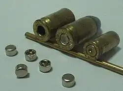 A la izquierda y centro, cartuchos de percusión central tipos Boxer y Berdan. A la derecha, cartucho de percusión anular.
