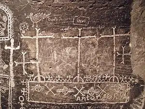 Dichos dibujos datan de diferentes años y siglos, el primero de ellos data de 1558, grabado en la celda inferior, aunque la mayoría son del siglo XVIII y se encuentran en la celda intermedia, apareciendo fechas como 1701, 1708, 1799, y algunos posteriores como 1809 o incluso 1910. Aparecen también algunos nombres propios, especialmente el de Miguel Guillen, que se repite en numerosas ocasiones, Domingo Lacoma, Miguel Viñuales, Jose Pardina, Pasqual Borruel, Jose Grillo, Tomás de Lione, Gorge, etc... y localidades como Oto y Fiscal. En la estancia superior el único grabado que nos consta es 1705 broto Antonio.