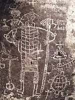 La tradición católica describe a San Cristóbal de Licia como un gigante cananeo que tras su conversión al cristianismo ayudaba a los viajeros a atravesar un peligroso vado llevándolos sobre sus hombros. El grabado de la Cárcel tiene aproximadamente 2 metros de altura y la inscripción del nombre del santo.