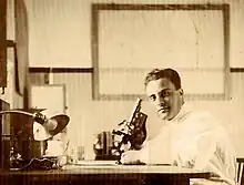 ![]() César Martín Cano en los laboratorios del Instituto Antipalúdico de Navalmoral de la Mata | ||