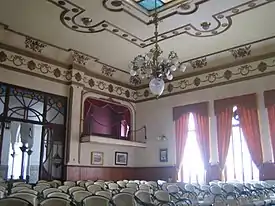 Por la puerta principal se accede a un amplio vestíbulo con una esbelta escalera que lleva a la planta superior. Todos los salones fueron reformados con el transcurso de los años. De los seis salones en los que fue distribuido el edificio, destacan: