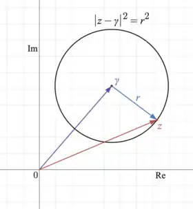 En el plano complejo, es un número complejo y es un conjunto de números complejos. Usando la propiedad de que un número complejo multiplicado por su conjugado es el cuadrado de su módulo (su distancia euclidiana desde el origen), una función implícita para es: