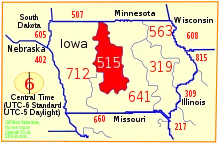 Códigos de área para el estado de Iowa, Estados Unidos, con el código de área 515 en rojo.
