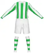 • Uniforme titular: camiseta verde y blanca de rayas verticales, pantalón también blanco y medias con rayas horizontales verdes y blancas.
