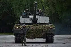 Los conjuntos de las orugas de marcha consisten en juegos duales de siete rines recubiertos de goma alineados, con cuatro piñones de retorno en cada lado con conectores de tipo cintado. Las cadenas son del tipo de doble pinado y fueron diseñadas por la firma alemana Diehl. La suspensión consiste de un sistema mixto de barras de torsión y de amortiguadores hidráulicos situados en cada lado de ambos brazos.