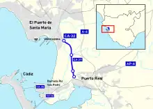 | CA-32 | El Puerto de Santa María Sur - Puerto Real Norte CA-35 AP-4 Viaducto de San Pedro (sentido Oeste y variante) Tramo ampliado Nudo de Puerto Real CA-35 AP-4 | 1 5,1 - | 1 carril por sentido: 1964[4] 2 carriles por sentido: 1996[2][3] 1971[5][6][7] |