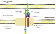 Correceptor CD4 uniéndose a la región no polimórfica del MHC (Complejo Mayor de Histocompatibilidad).