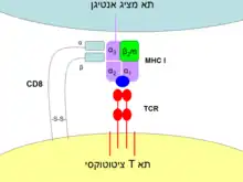 El dominio extracelular similar al IgV de CD8-α interactúa con la porción α3 de la molécula MHC de Clase I. Esta afinidad mantiene al receptor de células T de la célula T citotóxica y a la célula diana estrechamente unidos durante la activación específica del antígeno. Las células T citotóxicas con proteína de superficie CD8 se denominan células T CD8+. El sitio de reconocimiento principal es un bucle flexible en el dominio α3 de una molécula MHC. El dominio flexible α3 aparece entre los residuos 223 y 229 del genoma. Además de ayudar con las interacciones citotóxicas de antígenos de células T, el co-receptor CD8 también participa en la señalización de células T. Las colas citoplasmáticas del co-receptor CD8 interaccionan con Lck (proteína específica de linfocitos tirosín-quinasa). Una vez que el receptor de células T se une a su antígeno específico, Lck fosforila CD3 y las cadenas ζ del TCR que inicia una cascada de fosforilación que conduce a la activación de factores de transcripción como NFAT, NF-κB, y AP-1 que afectan la expresión de ciertos genes.