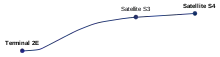 La línea 2 comienza alrededor de 500 metros al este de la estación Terminal 2-Gare, en la estación Terminal 2E, también indicada como Correspondance-Bagages-Sortie. Es una estación con andén central, pegada a la fachada del edificio. Después de atravesar un viaducto, bajan para pasar por debajo de la terminal satélite S3, donde se encuentra la estación con andén central Satellite S3, también anunciada como Embarquement: Portes L21 à L53. Prosigue la línea en línea recta hasta la estación Satellite S4, indicada asimismo como Embarquement: Portes M21 à M50.