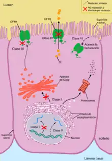 El defecto de procesamiento puede darse a lo largo de todo el gen CFTR y se relaciona con un fallo en la maduración de la proteína, sobre todo, con mayor afectación sobre el dominio NBD1.[19]