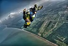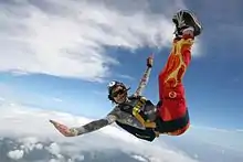 Durante la caída, los «saltadores», "buceadores del cielo" o skydivers, descienden a una velocidad variable, entre unos 180 y 300 km/h, lo que les permite «volar» de forma relativa, regulando esas velocidades de descenso y/o «desplazándose» al variar su trayectoria de descenso.