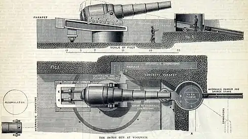 ![]() Dibujo esquemático del emplazamiento del cañón y su torreta de recarga. |