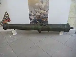 ![]() Cañón de a 8 libras de 1754 fabricado en la Real Fábrica de Artillería de Sevilla. | ||