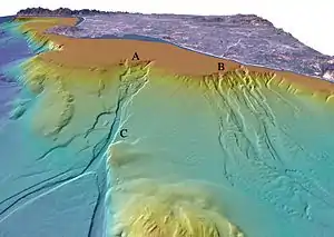 Cavidad de laderas empinadas que hiende el fondo del mar a través de la plataforma continental, a veces prolongada mar adentro a través del talud continental, y otras veces limitada al reborde de dicha plataforma, con lo que forma una profunda garganta abierta en el talud. El origen de estas formas del relieve es incierto. Se atribuyen a la erosión fluvial sub-aérea, dado un nivel del mar mucho más bajo que el actual; a la acción de barrido de la marea; a la actividad de las corrientes de turbidez; a la socavación efectuada por corrientes nacidas de manantiales emergidos en el fondo del mar. Ejemplos: la Fosse de Cap Breton, en el Golfo de Vizcaya; los cañones situados frente a la desembocadura del río Congo o frente al río Hudson, etcF. J. Monkhouse[1]
