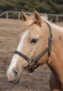 Es un correaje o guarnición de cuero o de seda que ciñe y abraza la cabeza del caballo.[1] Se emplea para sostener el bocado y las dos riendas. Está compuesta de testera, frontalera, muserola, ahogadero, carrilleras y portamozo. El ahogadero y la muserola están cogidos por detrás con dos anillas, que son las piezas por donde entran los ramales de la propia cabezada.[1]