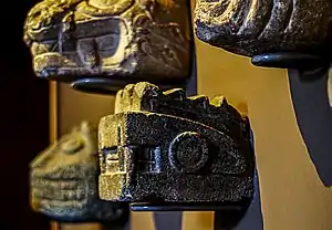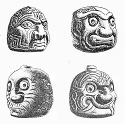 Las cabezas antropomorfas son bastante elaboradas sin dejar de ser gruesas, teniendo los ojos abiertos y la boca cerrada, rugosidades faciales y narices aplastadas, mostrando su dentadura algún caso de excepción. Las cabezas zoomorfas retratan las de los felinos, serpientes y aves de rapiña, siendo notorios los afilados colmillos que afloran de sus mandíbulas y picos. Las cabezas mitológicas, por último, son mezcla de facciones humanas y animales, tienen los labios gruesos y lucen frecuentemente cabelleras formadas por serpientes.[7]