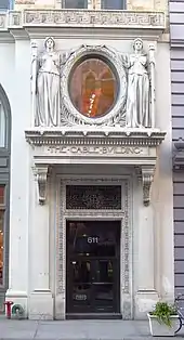 El Registro de Bienes Raíces y Guía de Constructores dio un aviso especial a la entrada occidental, diciendo: "Superando la entrada encantadora y acogedora hay una abertura ornamental redonda, que hace que el centro sea un grupo de dos figuras fuertemente modeladas, que por su apariencia y posición son fuertemente sugestivo en muchos sentidos del Gran Sello del Empire State. Estas figuras tienen 3,3 m de altura y son dignas de mención especial".[4] Sobre esta entrada hay dos figuras femeninas cubiertas que flanquean, que fueron creadas por el distinguido escultor escocés-estadounidense J. Massey Rhind. La ventana oval tenía un gran reloj, como se muestra en las fotos de alrededor de 1920. Al igual que el arquitecto Stanford White, Rhind fue un líder en el movimiento del "Renacimiento estadounidense". La figura de la derecha sostiene una espada en su mano, cuyo mango se rompió alrededor de la década de 1920. Permaneció desaparecida durante décadas hasta que fue reemplazada incorrectamente por una antorcha de llama para que coincida con la figura de la izquierda.