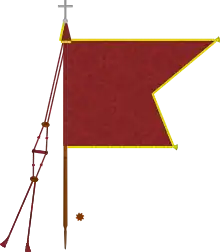 Pendón: De paño de seda damascada de color morado de 250 cm de alto por 350 cm de largo en la parte superior, 250 cm en la parte inferior y 200 en la parte central, lo que provoca un entrante en la parte exterior. Rematado de fleco dorado de rapacejo de 5 cm.
