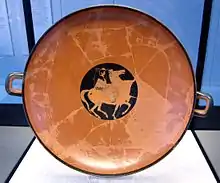 Copa decorada por Eufronio , hecha por Cacrilión en figuras rojas estilo rojo coralino.