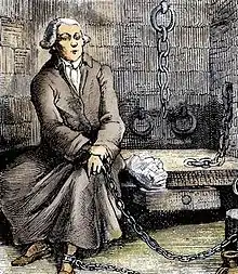 - también ha significado la reunión de presidiarios o galeotes que son conducidos a los lugares de la extinción de sus condenas porque iban sujetos con grillos de dos en dos llevando además unas argollas por donde se pasaba la cadena que aseguraba un grupo de doce o de catorce. Las penas de trabajos públicos para las que se aherrojaba a los criminales, solían a veces ser designadas con el nombre de cadena.