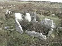 - Esta obra contiene una traducción total derivada de «Court cairn» de Wikipedia en inglés, concretamente de esta versión, publicada por sus editores bajo la Licencia de documentación libre de GNU y la Licencia Creative Commons Atribución-CompartirIgual 4.0 Internacional.