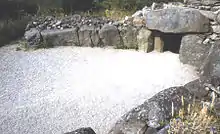 Los cairns con patio fueron cámaras rectangulares de entierro. Se distinguen por su patio de forma ovalada, sin techo, anexo al cairn en sí. Grandes losas de piedra se utilizaron para hacer las paredes que eran cubiertas, en la cámara, por otra gran losa para crear un techo.