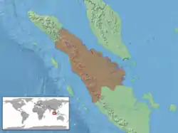 Es endémica de Sumatra y algunas islas e islotes adyacentes en el estrecho de Malaca.
