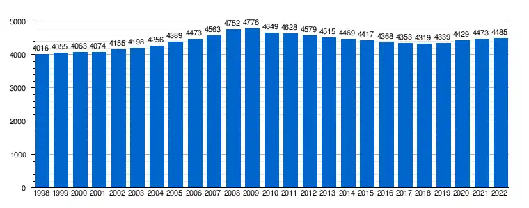 | Gráfica de evolución demográfica de Calamocha[5] entre 1998 y 2022 |
