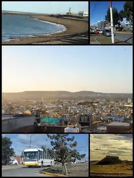 ![]() Desde arriba, de izquierda a derecha: Balneario Caleta Olivia y calle céntrica; vista al norte, un autobús de Autobuses Caleta Olivia, y Cerro Pan de Azúcar.
