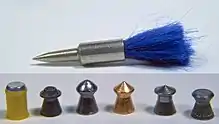 ![]() Diábolos, de izquierda a derecha: punta plana, punta redonda, punta hueca y punteado. Arriba: calibre 5,5 mm. Abajo: calibre 4,5 mm. | ||