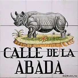 Figura con el mismo nombre tanto en el plano de Teixeira de 1656 como en el posterior de Espinosa (1769),[3] y se conservan antecedentes de construcciones particulares desde 1776.[1] Una versión de su legendario origen cuenta que los terrenos de esta calle fueron propiedad de fray Pedro de Guevara, prior de San Martín, según lo refería el padre Sarmiento,[1] y que su sorprendente nombre se debió a la cesión que Felipe II hizo al monasterio del rinoceronte (‘abada’ por otro nombre) que le regaló en 1501 el gobernador de Java (en las bautizadas islas Filipinas), y que sería el que dibujó Juan de Cufes en su Tratado de varia conmensuración.[4] Razona Pedro de Répide lo absurdo de la cesión de tal regalo, teniendo Felipe II otros mejores parques donde colocar su exótico animal, y propone como más probable la presencia en las eras del priorato de San Martín de unos saltimbanquis portugueses que traían una «abada» o rinoceronte[5] hembra, atracción muy popular entre los chicos del barrio. Una vez más sería un suceso terrible el que grabara en la memoria madrileña el nombre de aquel animal, pues ocurrió que habiéndole ofrecido un bollo caliente (un 'mollete abrasando' especifica Répide) un mozo del vecino horno de la Mata, enfureció a la bestia, que rompiendo la valla que la enjaulaba arremetió contra el desdichado muchacho hasta matarlo. Fugado el rinoceronte, tras una noche tragicómica en que el pueblo de Madrid la buscó acosando sombras, aparació al día siguiente en las lejanas eras de Vicálvaro.[4][1][6]
