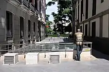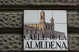 ![]() Placa de azulejos del callejero del Madrid antiguo con una vista de la catedral de La Almudena, hacia 2000 (la representación no hace referencia a la iglesia de Santa María de la Almudena, demolida en 1868, y que se encontraba en esta calle). | ||