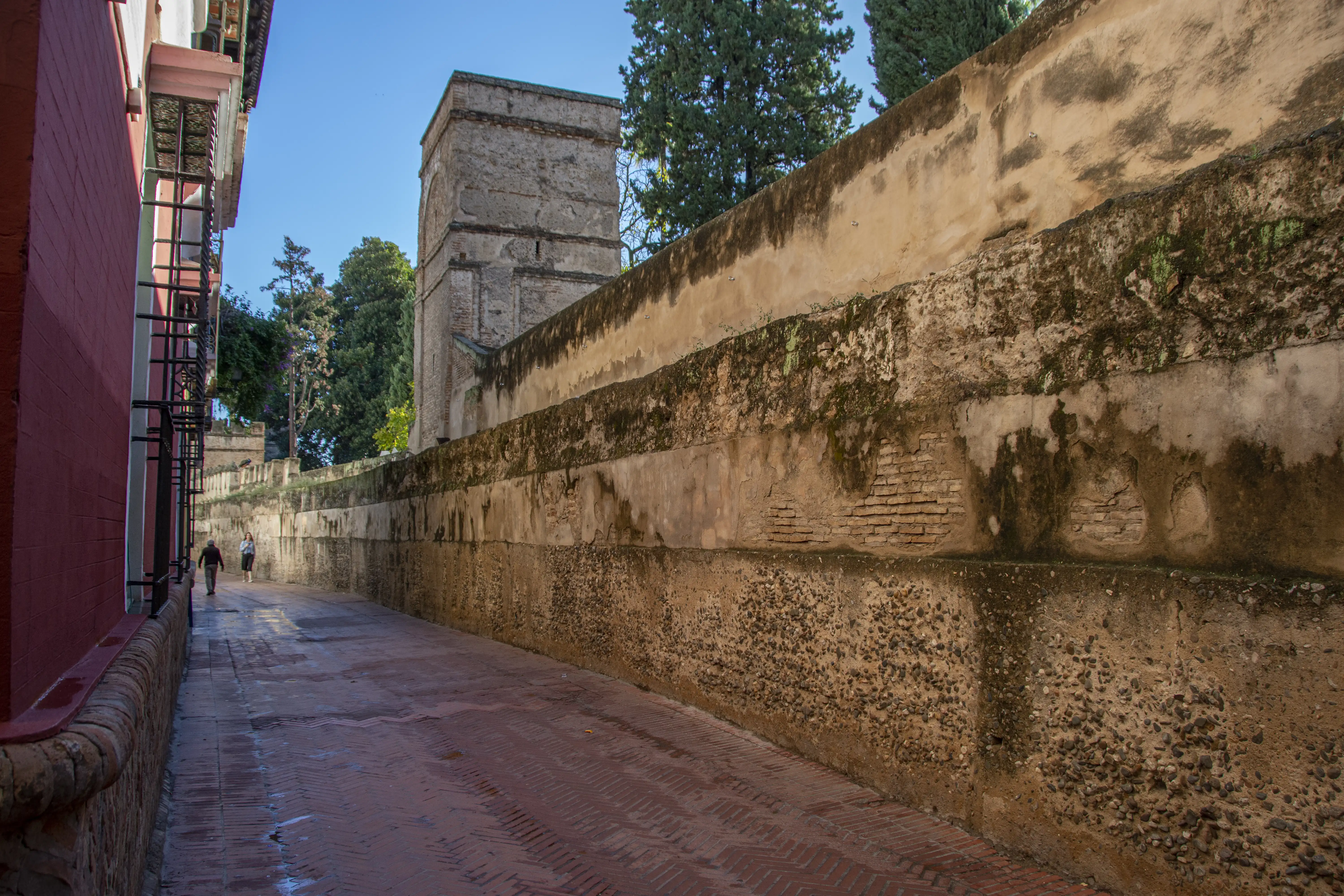 Calle del Agua. Es de cuartel B. y de la ayuda de parroquia de santa Cruz. Es una calle inmediata al muro de la ciudad por donde pasan las aguas de los caños de Carmona, que van al vecino Alcázar, y se llama asi porque en un tiempo se labrava en ella el agua fuerte. Vá de la calle del Chorro á la carnicería del Alcázar: y fué de la Alhamia de los judios.(González de León, 1839, p. 156)