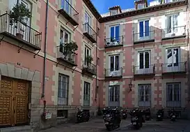 En Madrid hubo varias calles con título de «calle Real» o «cal del Rey» en una misma collación. Una de ellas fue la llamada a partir del siglo XVI «calle Real de la Almudena», vía importante de la que ya se tiene abundante noticia por los documentos de compraventa y propiedad del año 1220. Sus casas habitadas por personajes ilustres estarían en la manzana 443, frente a la calle del Arco del Palacio.[16] Se trata de lo que fue el primer tramo de la futura calle Mayor. Al ser un lugar tan preferente estuvo habitada por gente de prestigio en época medieval. Contaba además con la primitiva iglesia mayor de Santa María,[lower-alpha 2] y frente a esta parroquia se encontraba la casa principal de la familia Bozmediano —o Vozmediano—, de la aristocracia madrileña.[lower-alpha 3] Cuando desapareció esta casa en su solar se edificó el palacio del duque de Uceda que después fue palacio de los Consejos y Capitanía General.[35]