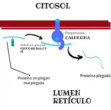 El plegamiento ocurre gracias a la intervención de chaperonas y otras enzimas, que reconocen las proteínas desplegadas o mal plegadas y las pliegan para que logren una conformación estable funcionalmente activa; es aquí donde actúa la calnexina. No obstante, este proceso es el punto donde más errores se producen en todo el proceso de síntesis de proteínas. Por ello, el RE posee un sistema de control de calidad del plegamiento, que consiste en exportar únicamente aquellas proteínas plegadas correctamente y dirigir a la degradación las que no lo están, evitando así la acumulación de proteínas defectuosas que puede conducir a la apoptosis. Este proceso se conoce como UPR (respuesta a proteínas desplegadas) y ocurre cuando hay muchas proteínas mal plegadas, lo que lleva a un aumento en la síntesis de chaperonas o la apoptosis en caso de que esta medida no sea suficiente.[2]