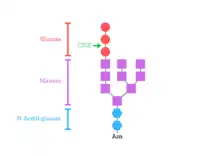 - El primero y mejor descrito es la N- glicosilación cotraduccional de residuos de Asn de proteínas nacientes. La subunidad catalítica (STT3) de la oligosacariltransferasa (OST) transfiere un glicano preensamblado (Glc3Man9GlcNAc2) a N- residuos (Asn) de la secuencia N-X- Ser/Thr (donde X puede ser cualquier aminoácido excepto Pro) de las proteínas aceptoras. El corte y empalme de los residuos de glucosa terminales da lugar a un glicano monoglucosilado (Glc1Man9GlcNAc2) unido a la proteína diana, que favorece el plegamiento catalizado por las chaperonas tipo lectina (calnexina y calreticulina).