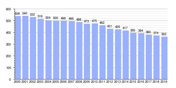 | Gráfica de evolución demográfica de Calo (aldea) entre 2000 y 2019 |