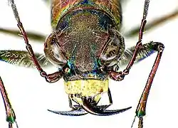 Su cuerpo es aplanado y mide aproximadamente 10–17 mm. Las cubiertas de sus alas son de color verde brillantemente oscuro, con manchas claras simétricamente y gris azulado. Sus patas son alargadas, lo que facilita su movimiento.